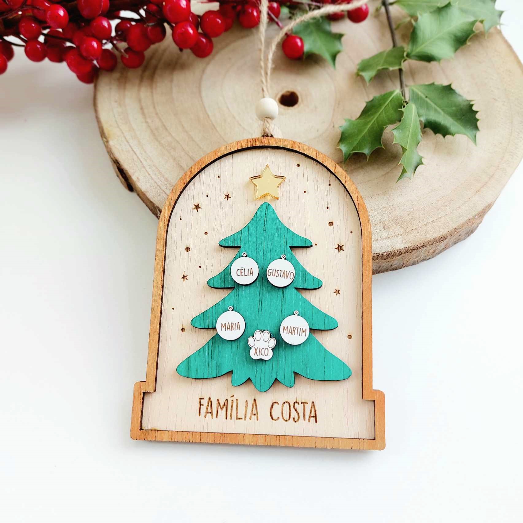 Bolas de Natal: Cada galho decorado com enfeites personalizados, contendo os nomes de cada membro da família.
