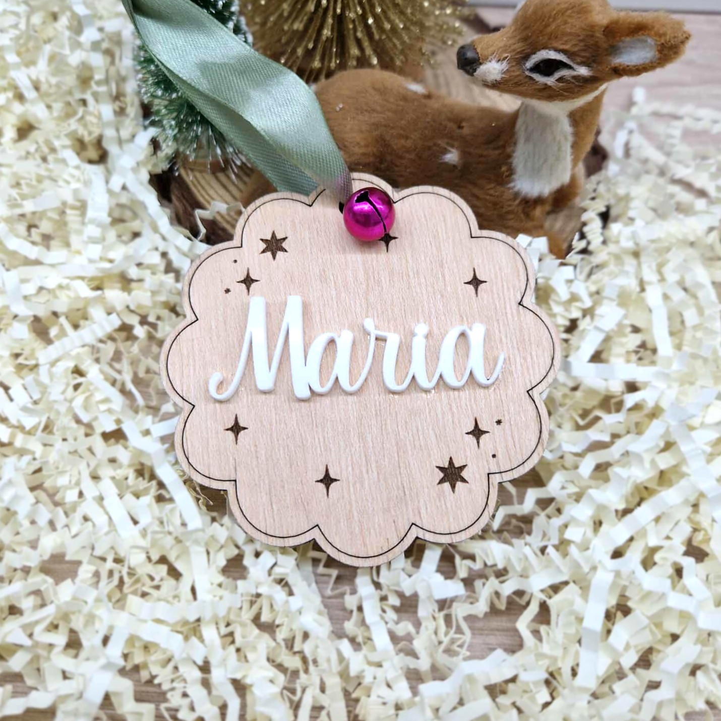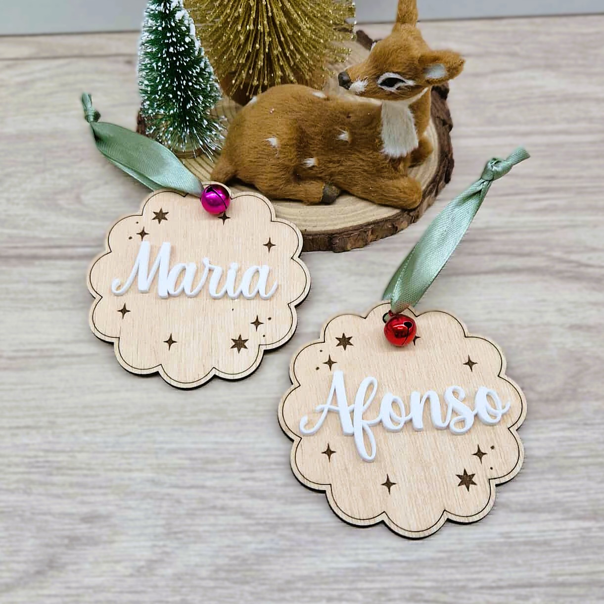 Um toque sofisticado para a sua árvore! Insira o nome desejado no campo de personalização. Ele será recortado em acrílico branco e aplicado sobre a base de madeira, criando um contraste delicado e moderno.