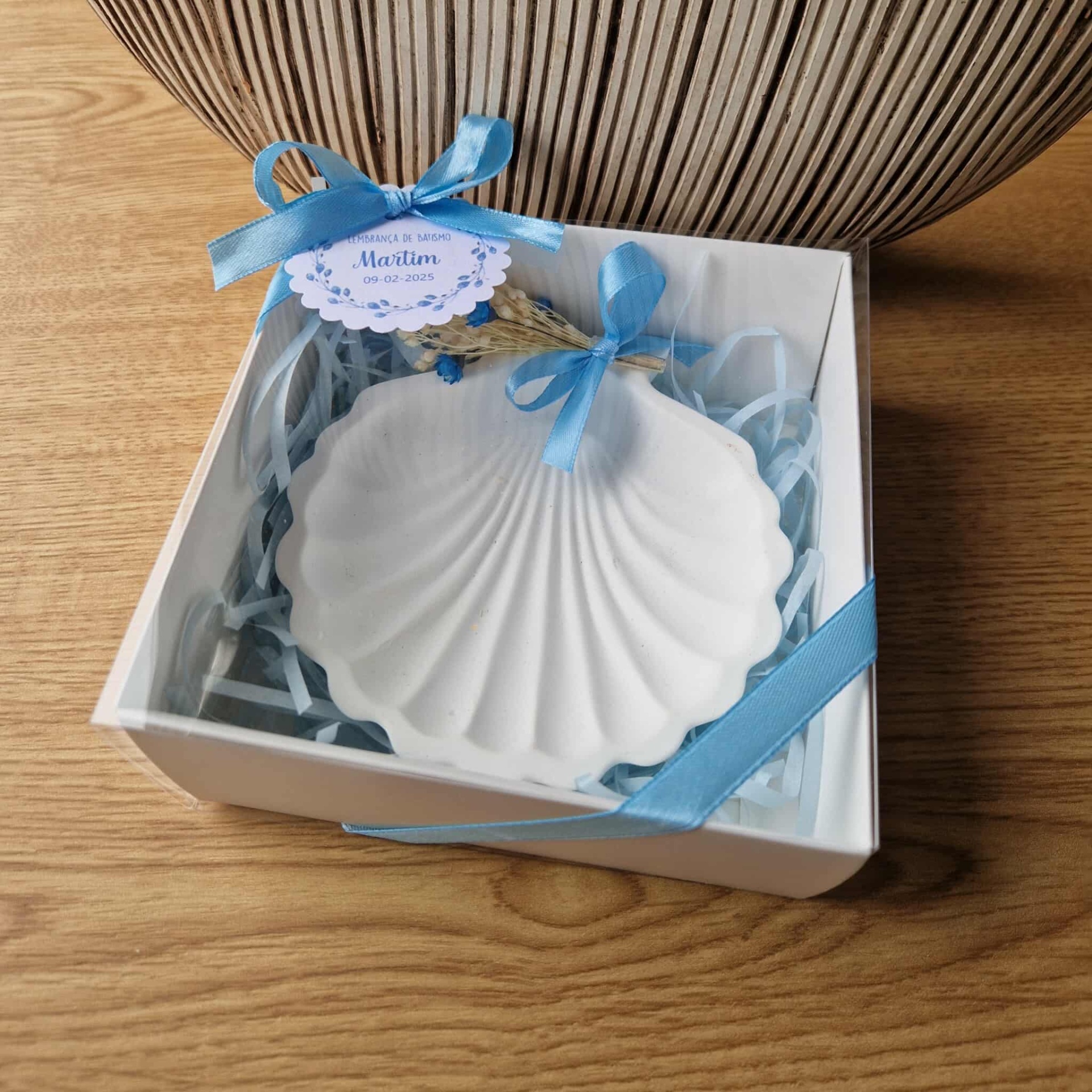 Uma caixa personalizada com uma concha em gesso perfumado é delicada, simbólica e cheia de charme, perfeita para eternizar esse momento especial.
