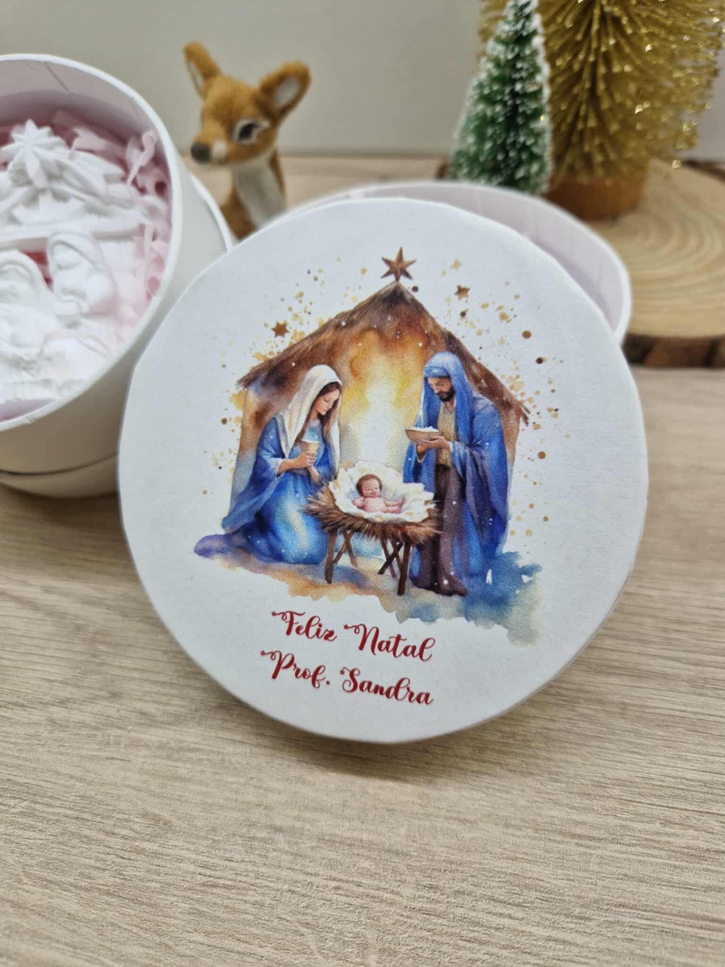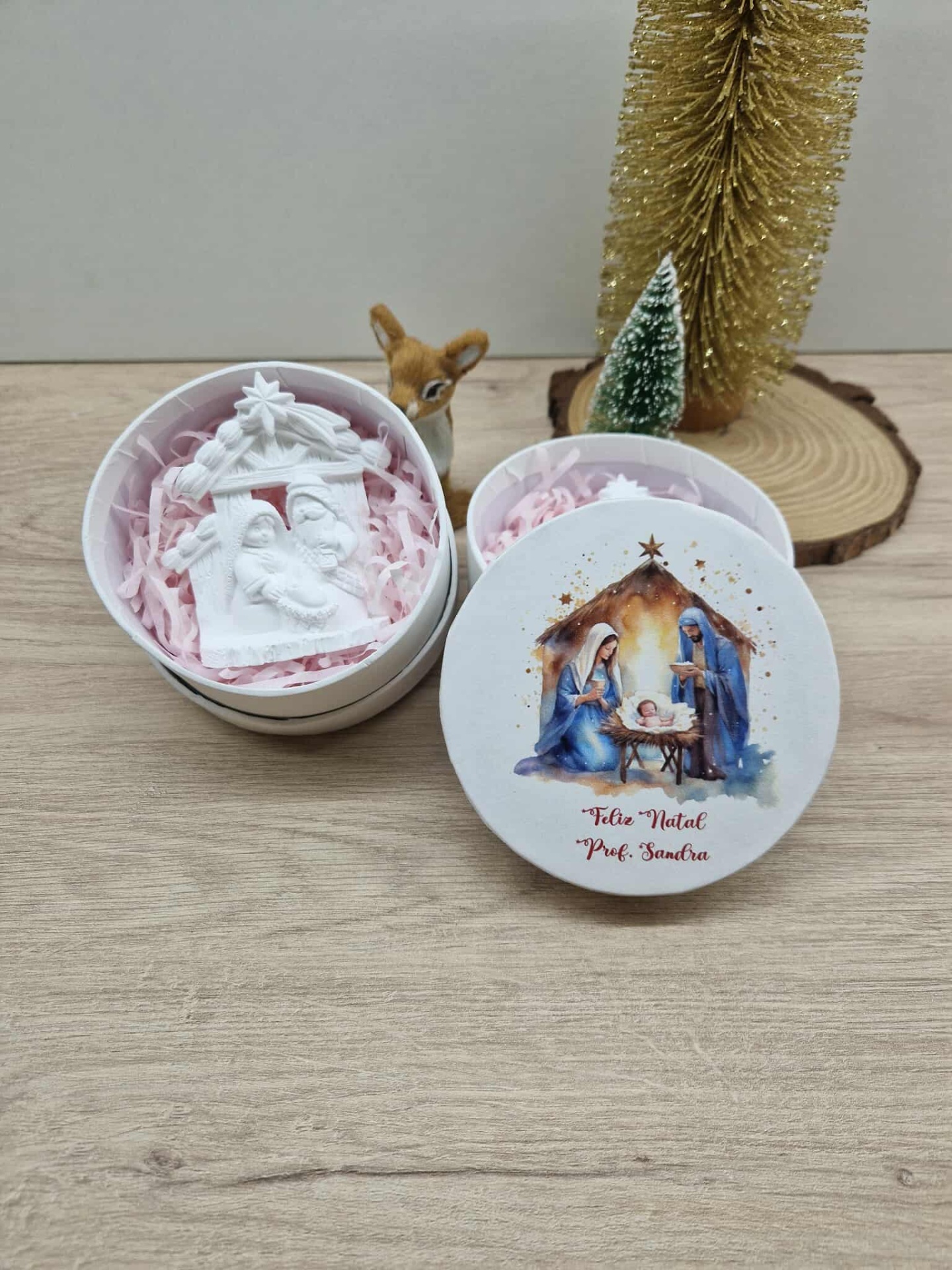 Uma caixa personalizada com um presepio de gesso perfumado  delicado, simbólico e cheio de charme, perfeito para presente de natal .