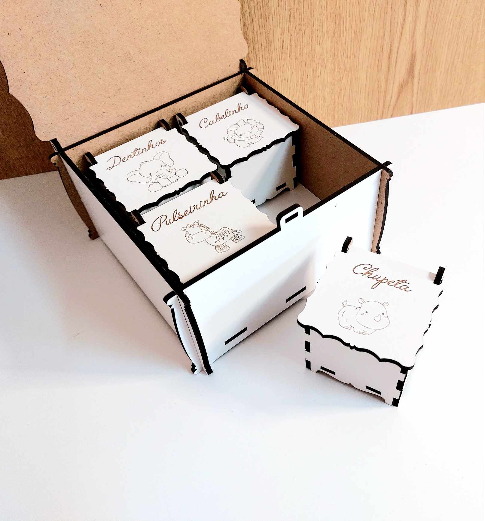 Caixa de Recordações para Bebé, as memórias de quando eram pequeninos! Inclui caixa de madeira grande com quatro caixinhas interiores Dimensões da caixa grande: 15cm x 15cm x 8cm Dimensões de cada caixinha interior: 6cm x 6cm x 5,5cm