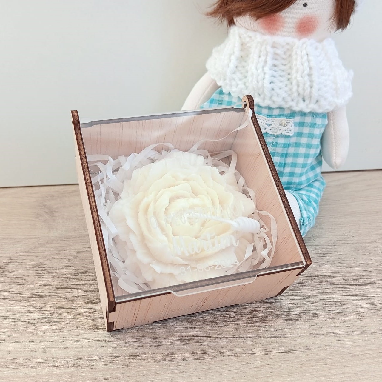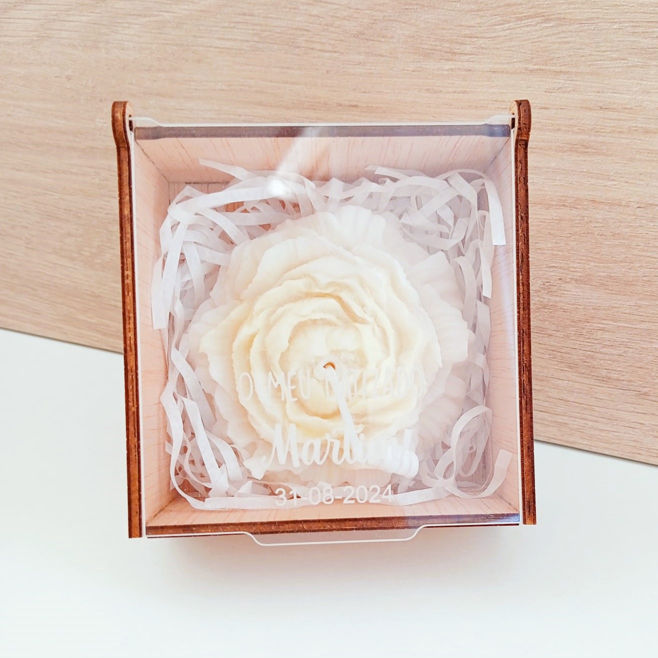 Lembrança caixa de madeira e tampa acrilico transparente com a personalização gravado a lazer no acrilico, vela artesanal no formato flor