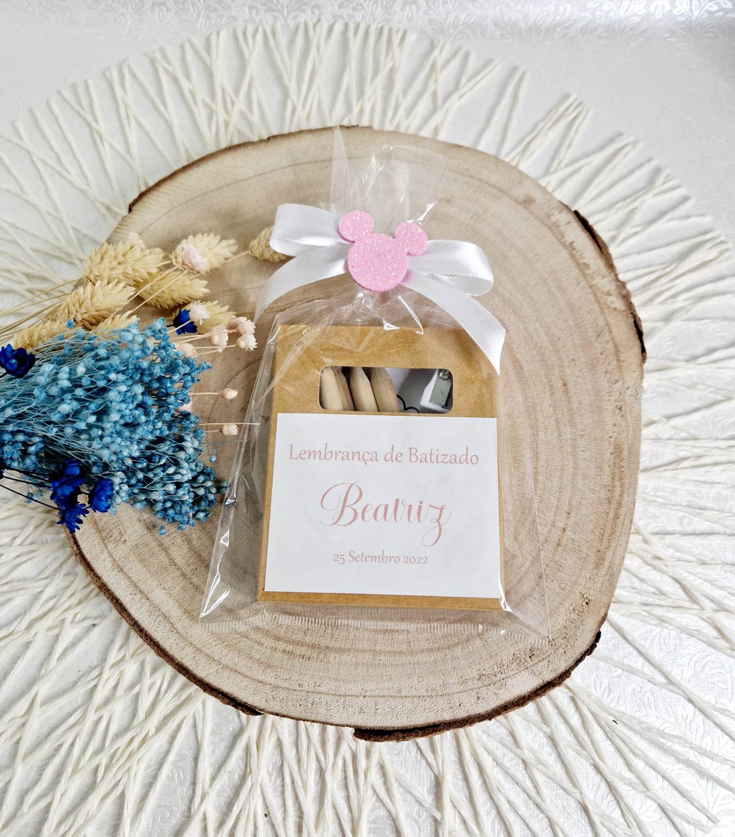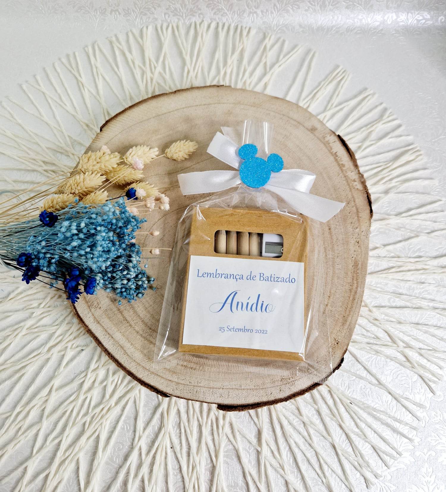 Caixa Kraft com 6 lápis de cor (cores aleatórias) + afia + mini-bloco c/20 desenhos para colorir; Produzido com o tema escolhido para a festa; Inclui a personalização dos textos (nome e idade).