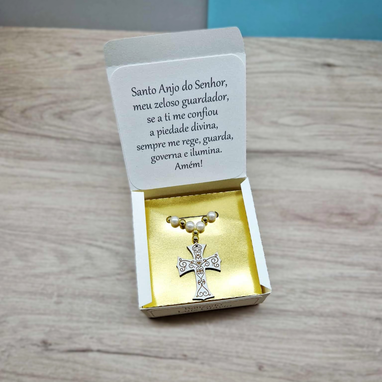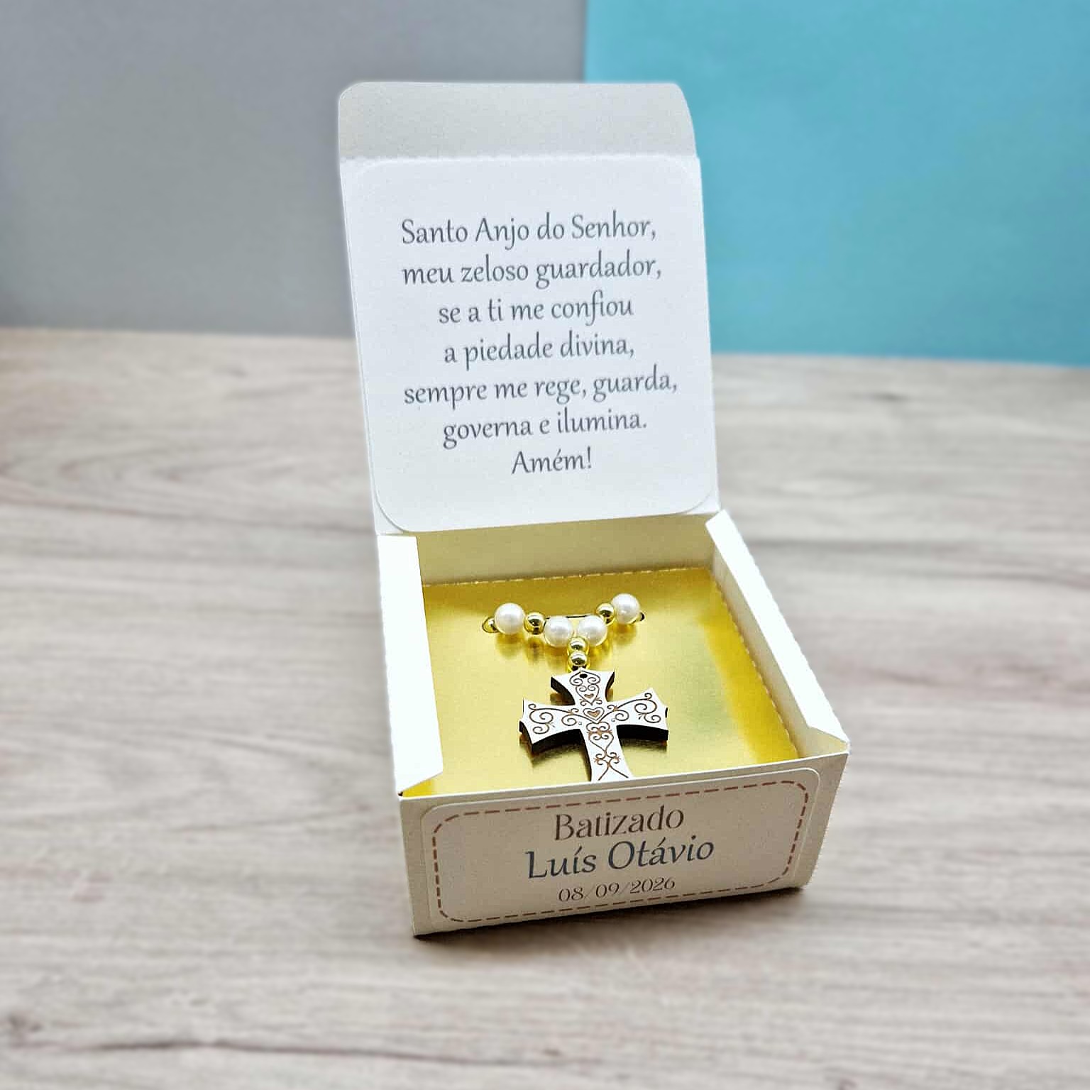 Uma lembrança delicada e simbólica, ideal para Batismo, Primeira Comunhão, Profissão de Fé, Crisma ou outras celebrações religiosas. A caixa de papel com mini rosário é uma opção elegante, leve e perfeita para oferecer aos convidados.