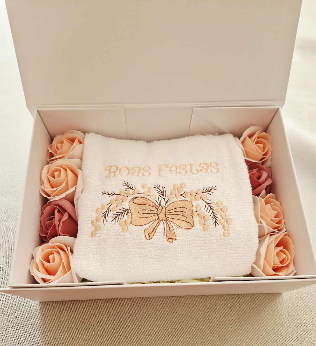 Toalha bordada com mensagem especial, símbolo de aconchego e ternura. Rosas de sabão rosas de sabão são uma alternativa sofisticada às flores naturais. Embalagem elegante com personalização, tornando o presente ainda mais inesquecível. Ideal para dizer “obrigado por tudo” com um toque de sofisticação e muito amor.