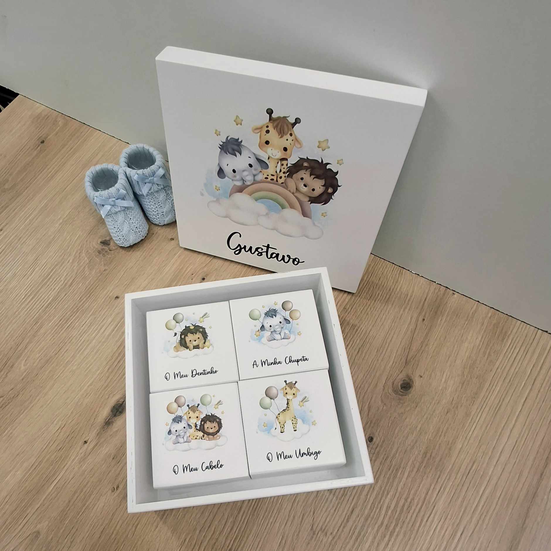 Guarde os primeiros momentos para sempre! Transforme as primeiras memórias do seu bebé num verdadeiro tesouro com esta encantadora Caixa de Cubos para Recordações. Feita em madeira e com um design delicado, esta caixinha quadrada inclui quatro compartimentos decorados para guardar itens especiais como:
