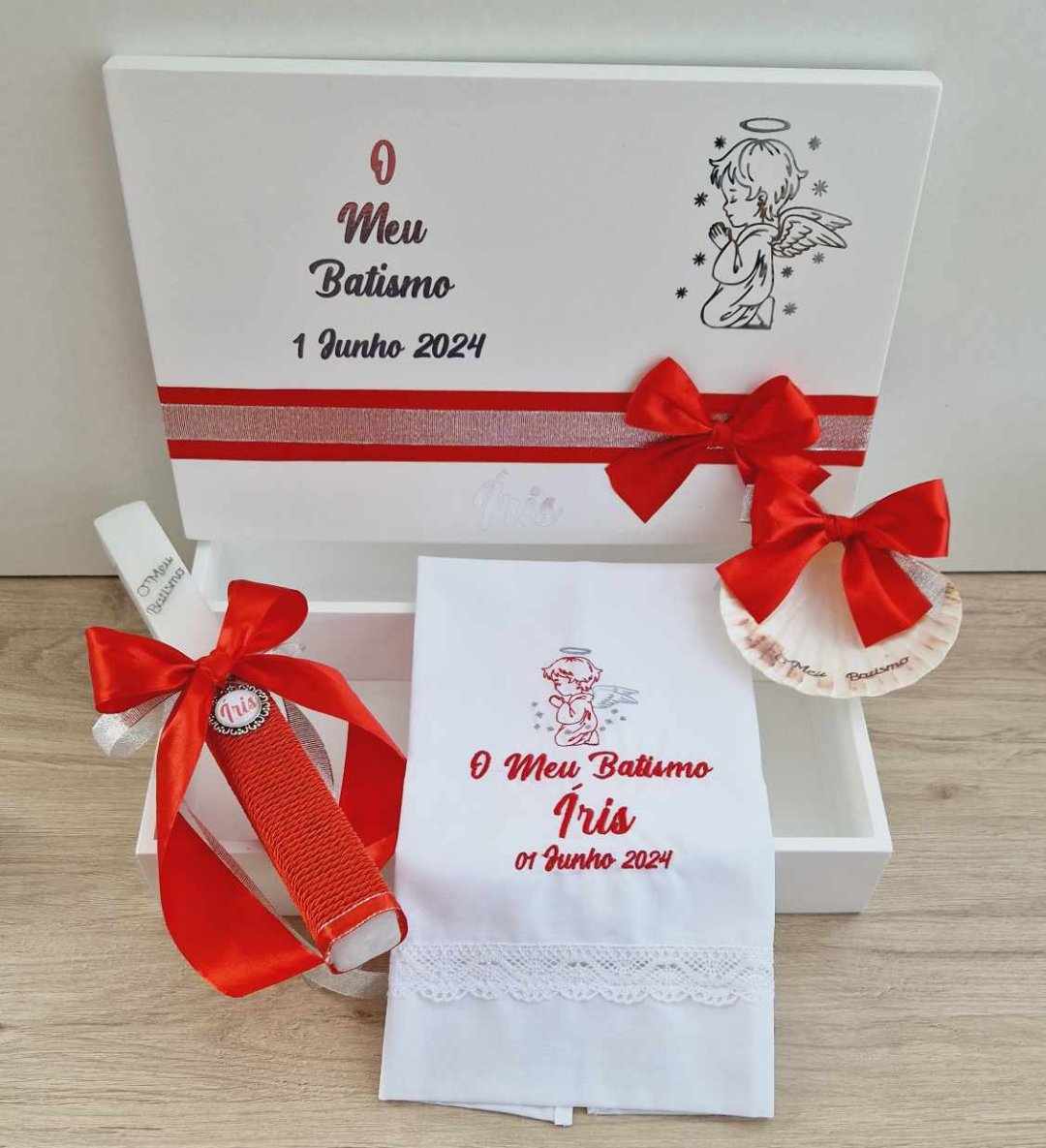 Caixa de batizado, vela de batizado, toalha de batizado e concha de batizado.