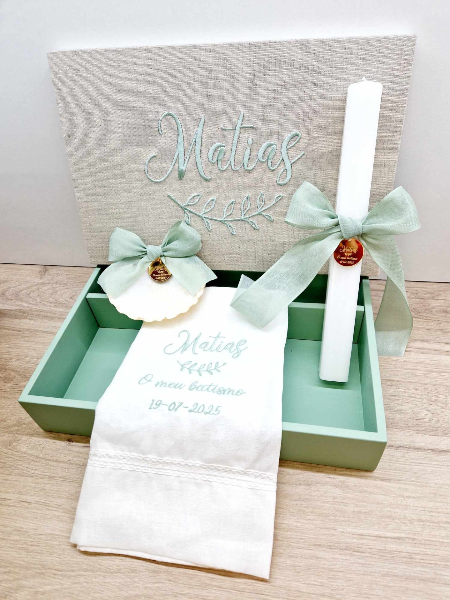 Caixa de batizado personalizada, vela de batizado quadrada personalizada e medalha acrilico dourado, toalha de batizado bordada, concha natural com medalha acrilico dourado .