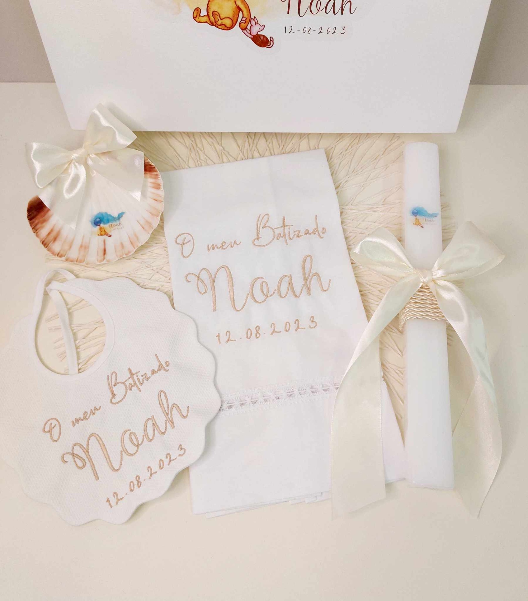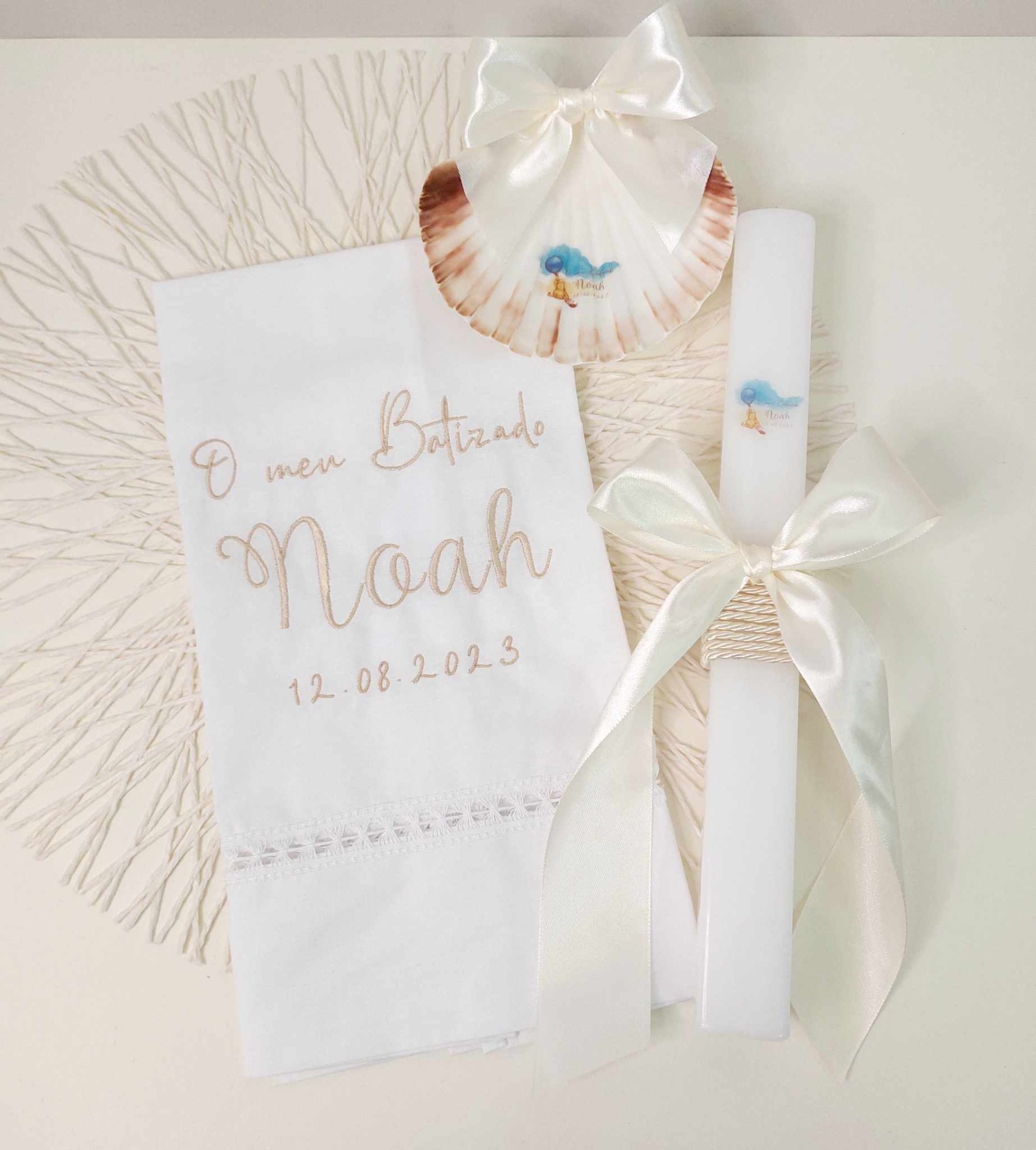 Caixa de batizado estampada, vela de batizado quadrada, toalha de batizado bordada, concha de batizado e babete bordada.