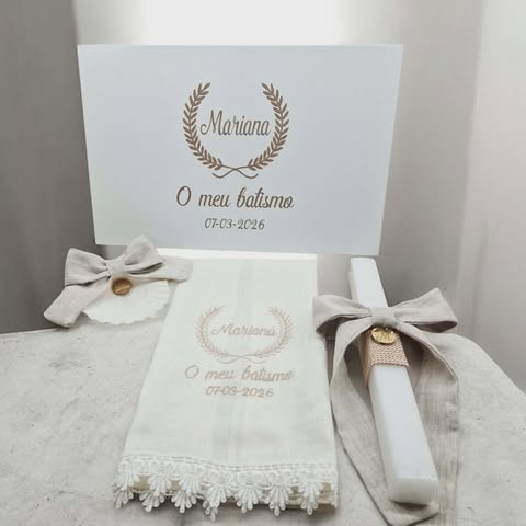 Caixa branca lacado com gravação a lazer totalmente personalizada, toalha linho bordada , concha e vela com medalha dourado espelhado personalizado ,fitas de tecido linho .