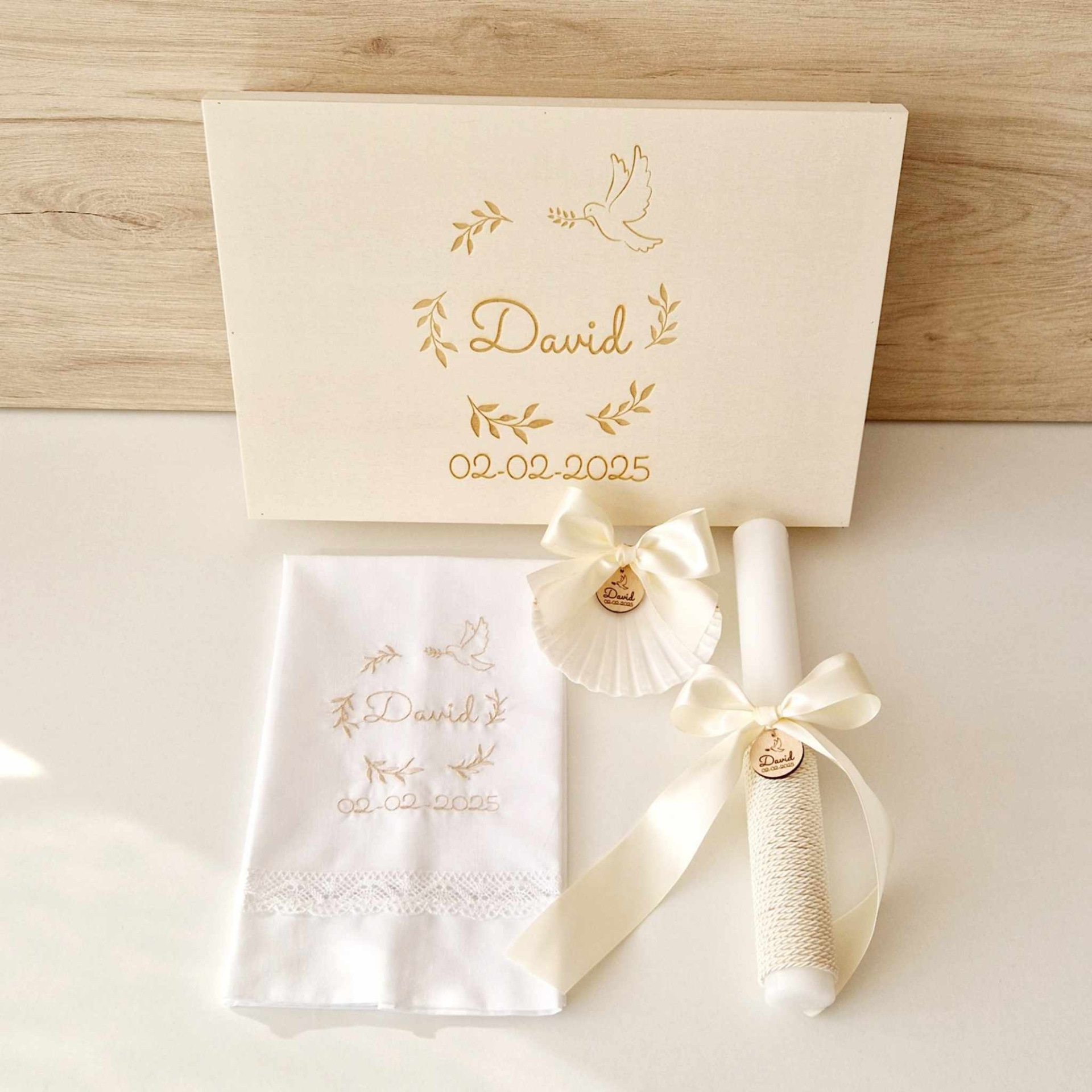 Caixa de batizado personalizada, vela de batizado redonda personalizada medalha madeira, toalha de batizado bordada, concha natural medalha personalizada