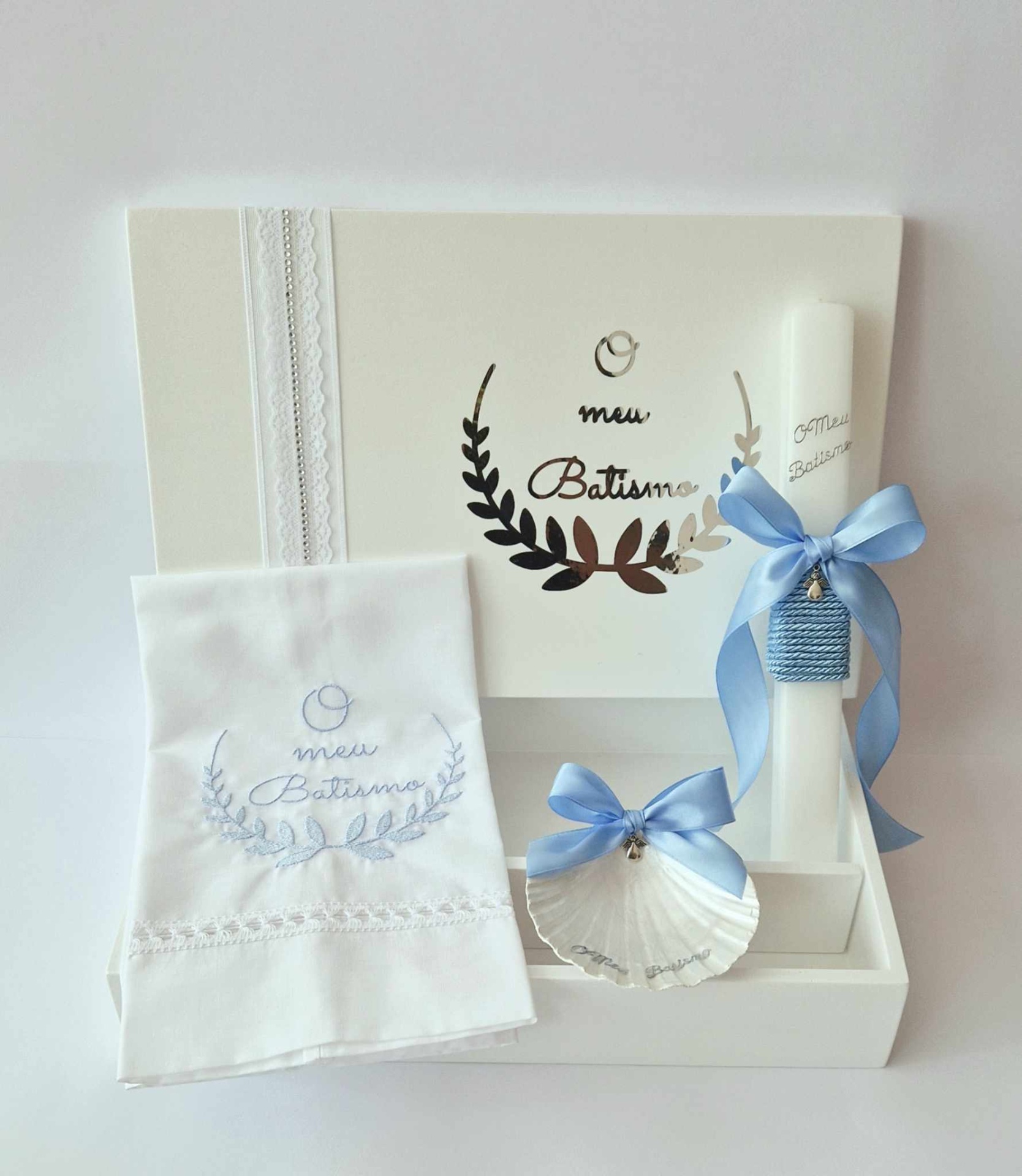 Caixa de batizado personalizada, vela de batizado quadrada , toalha de batizado bordada em algodão, concha perolada .