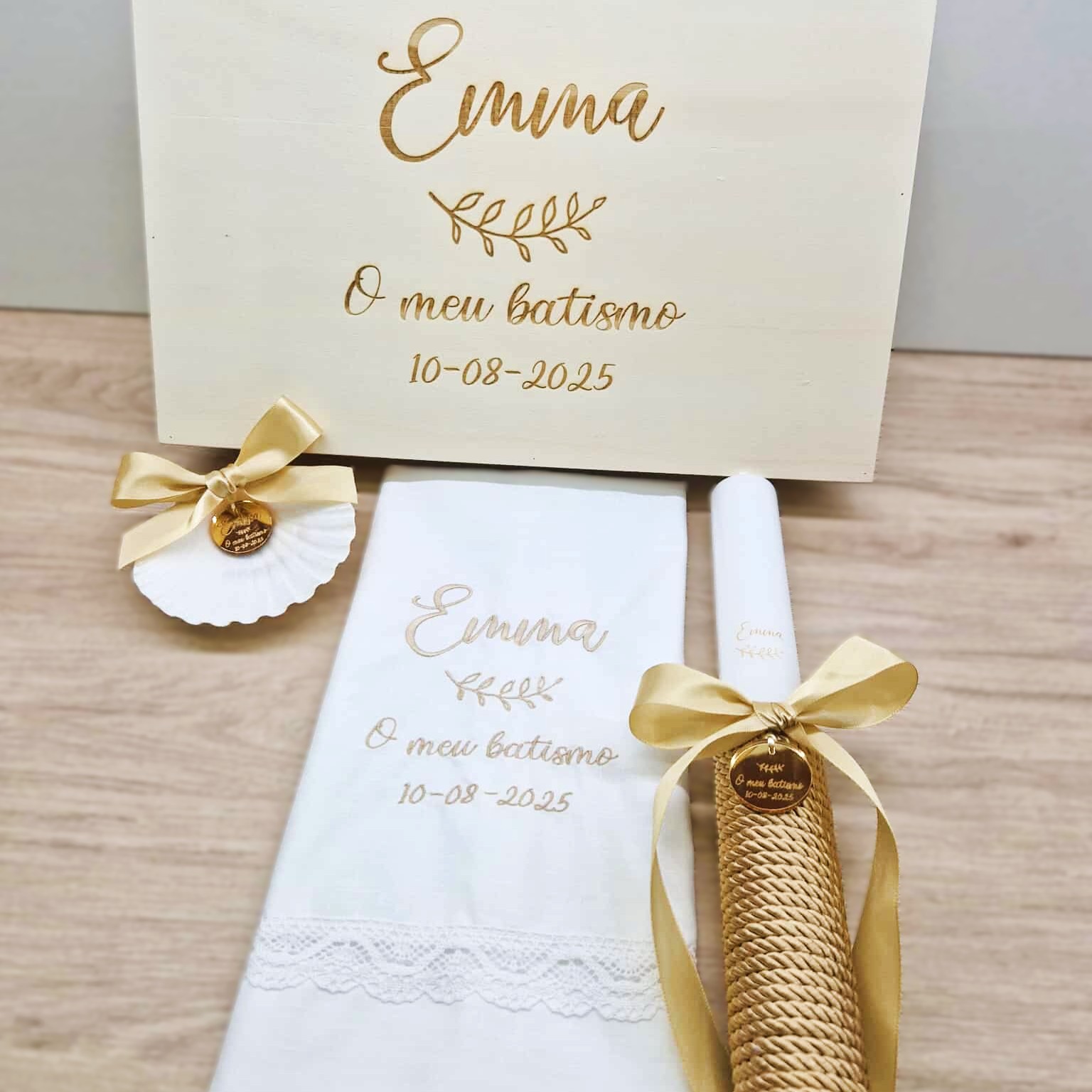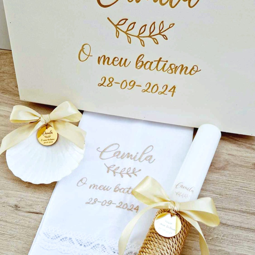 Caixa de batizado personalizada, vela de batizado redonda personalizada medalha acrilico ouro gravado, toalha de batizado bordada, concha natural medalha personalizada acrilico ouro.