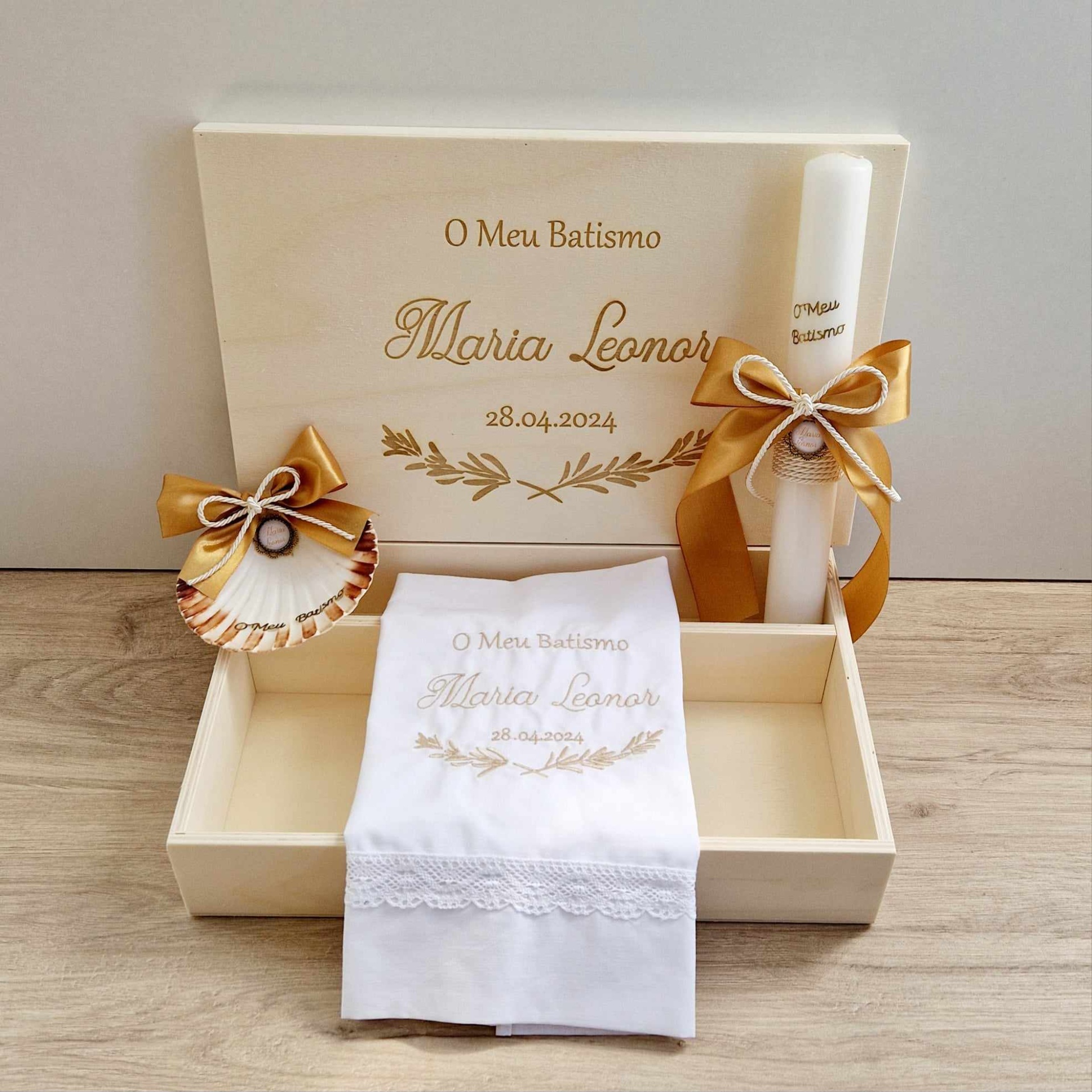 Caixa de batizado personalizada, vela de batizado personalizada com medalha, toalha de batizado bordada, concha natural medalha personalizada