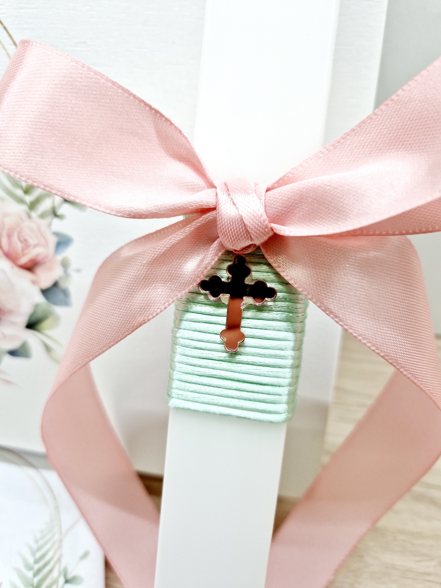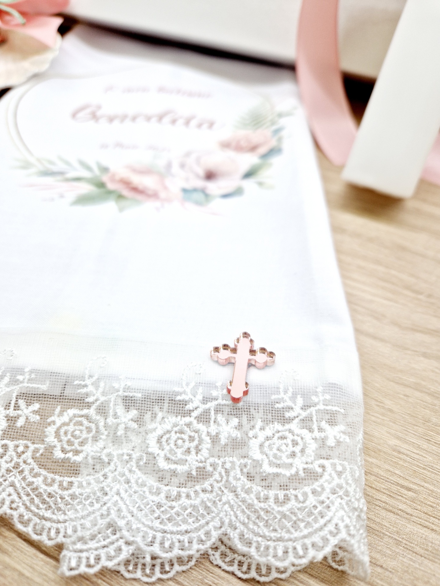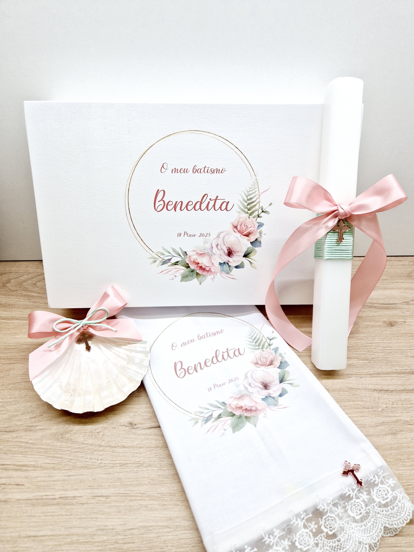 Caixa de batizado lacada e impressão uv, vela de batizado quadrada, toalha de batizado impressão uv, concha de batizado natural  .