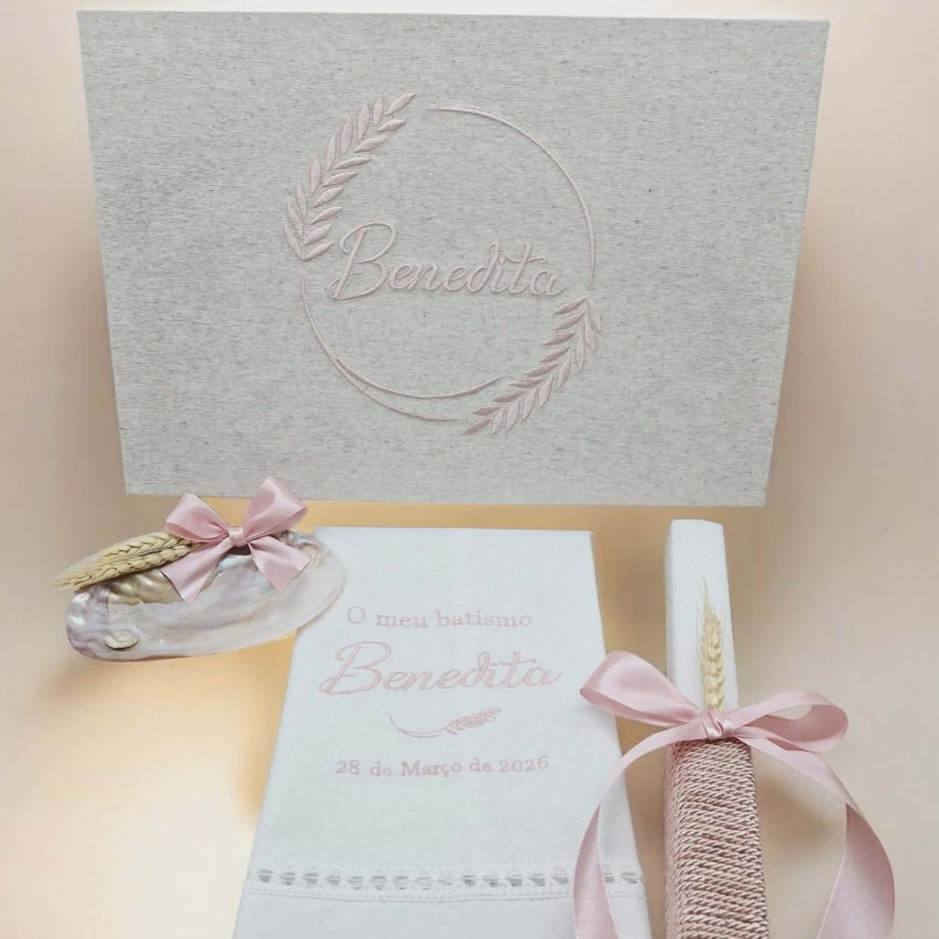 Caixa de batizado personalizada, vela de batizado quadrada personalizada e trigo natural seco, toalha de batizado bordada, concha natural madrepérola.