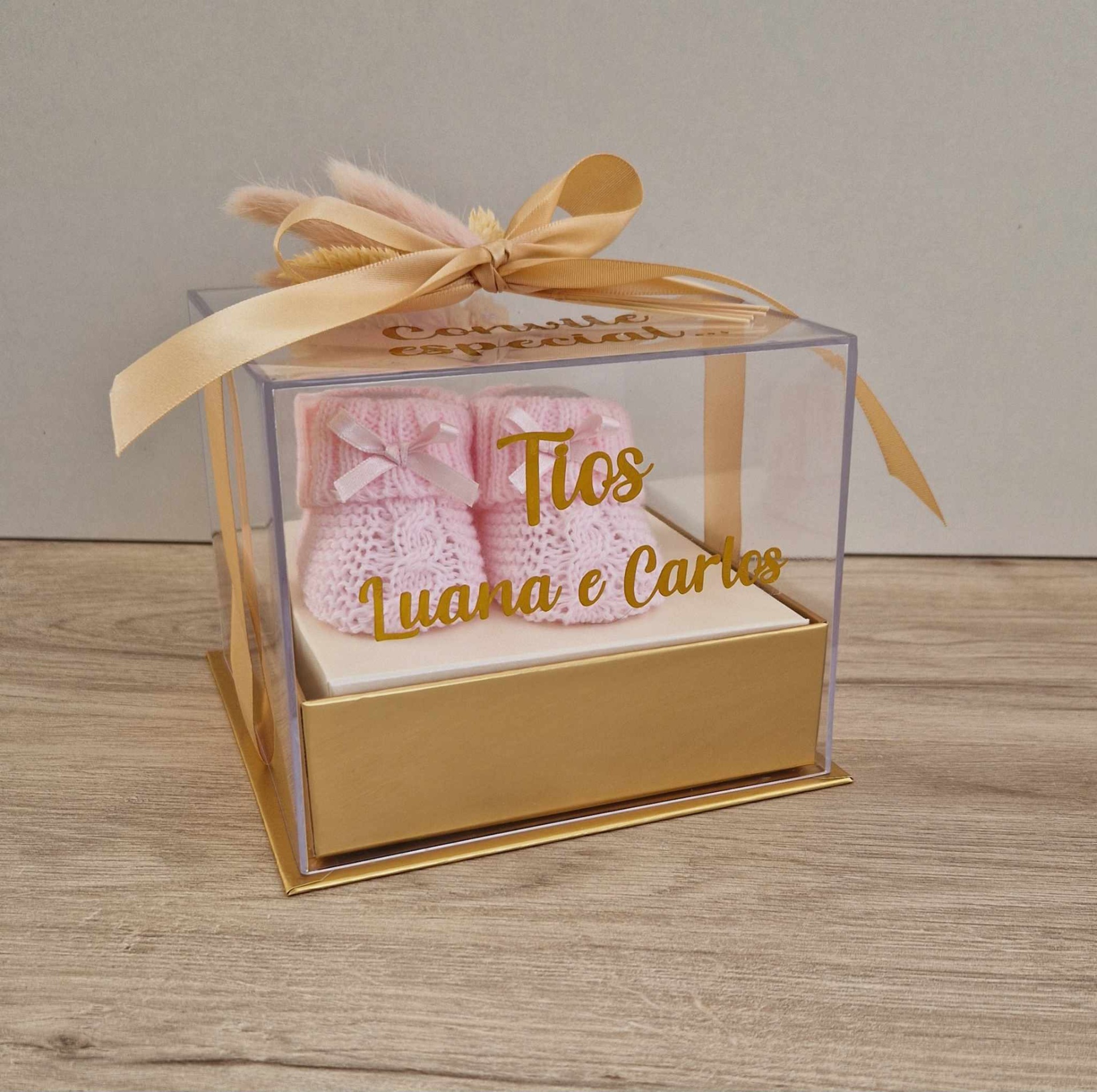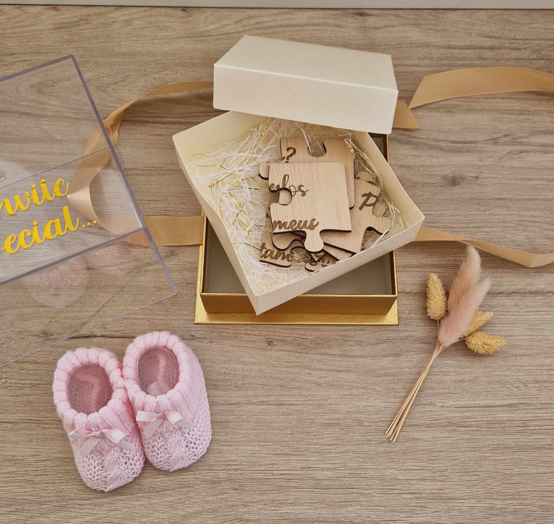 Caixa personalizada com carapins e convite em forma de puzzle.