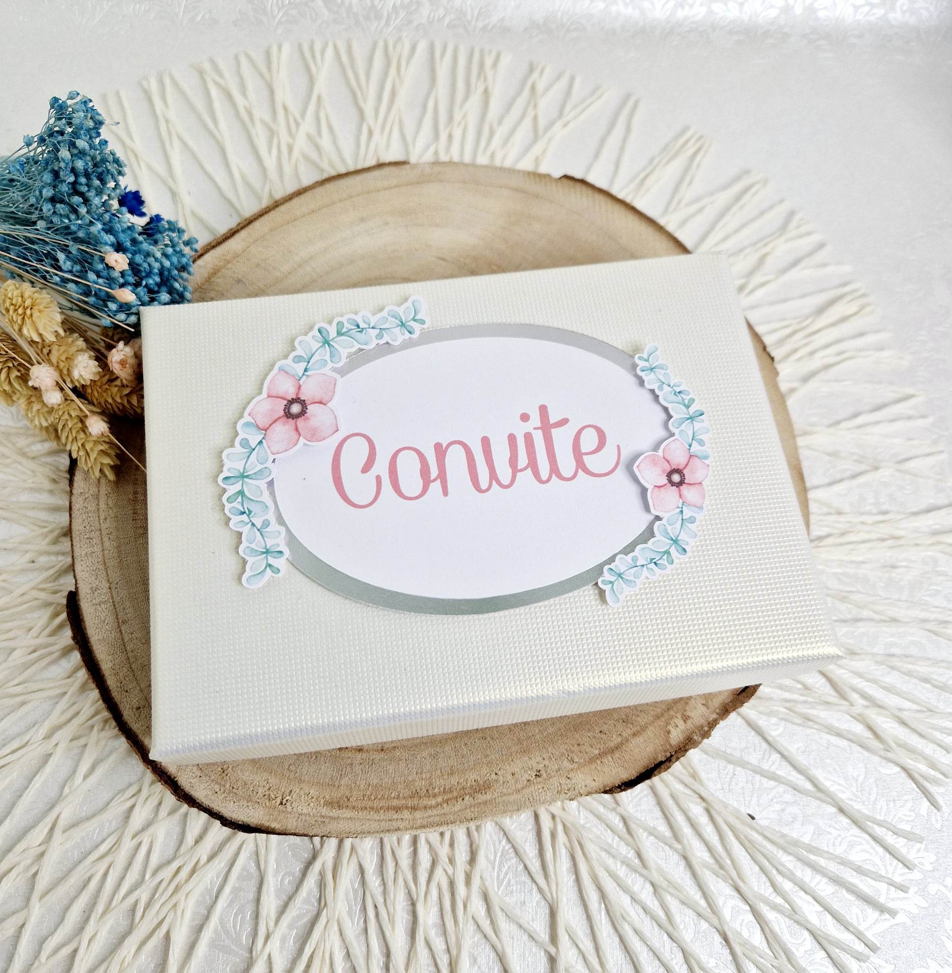 Caixa convite personalizada cor perolado e textura delicada,