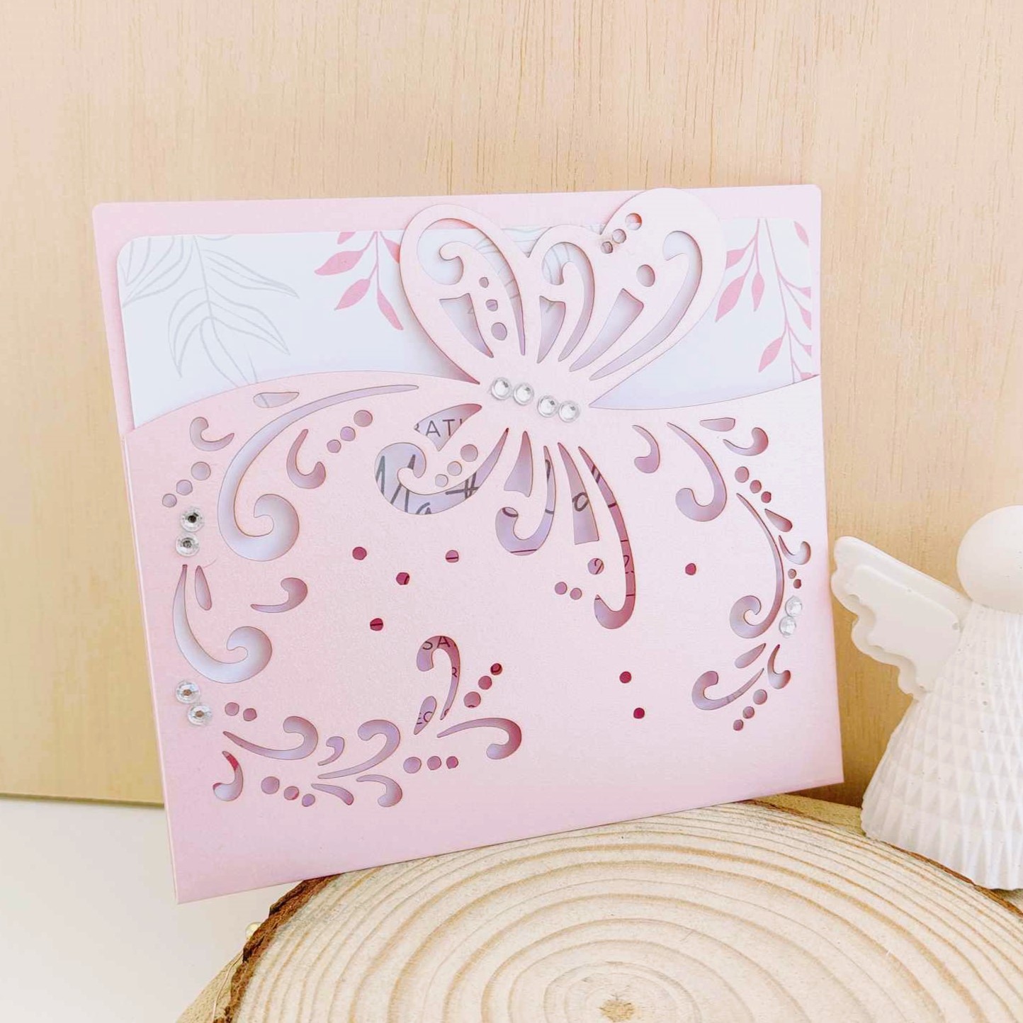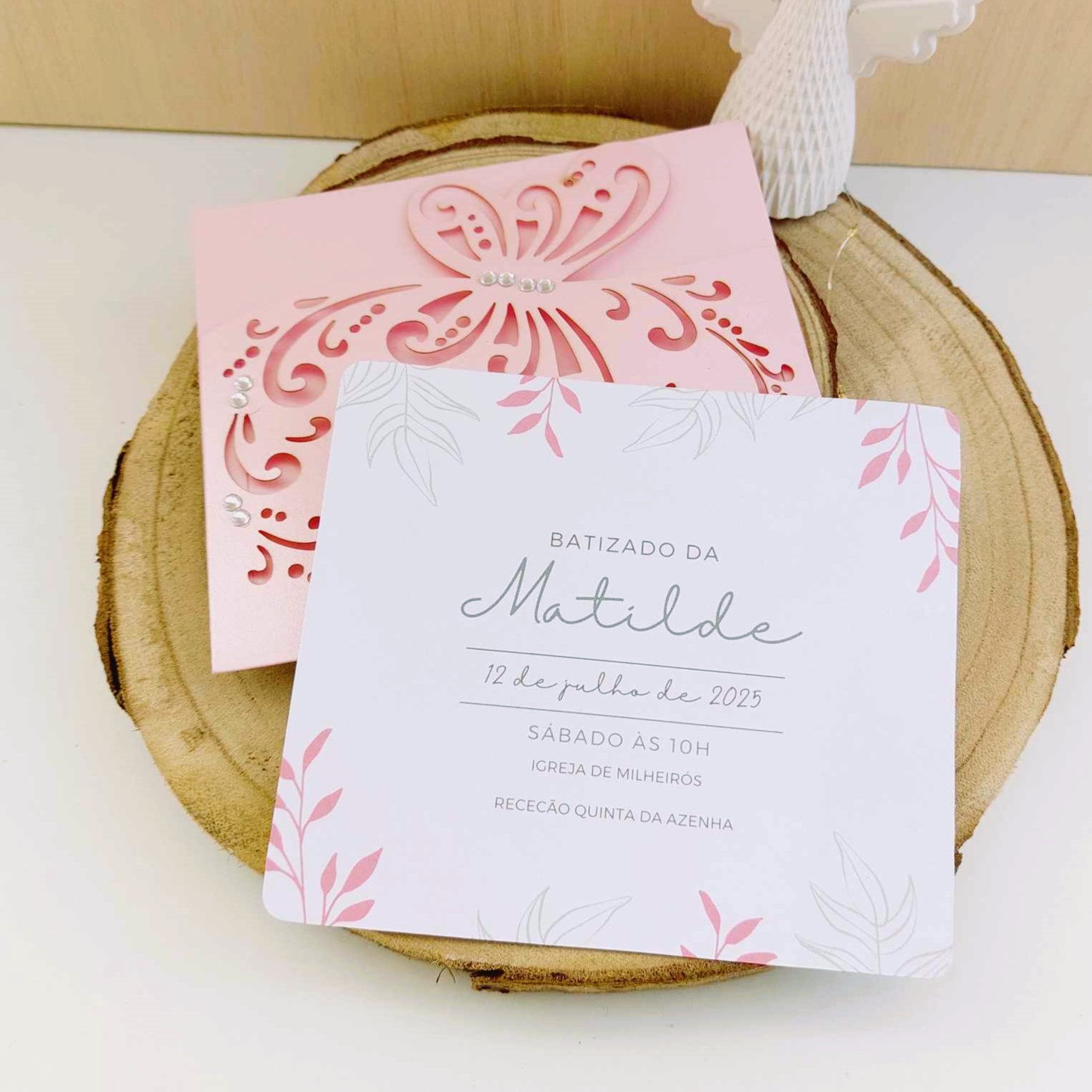 O Convite Rosa Borboleta é perfeito para batismos, casamentos ou outros eventos marcantes.