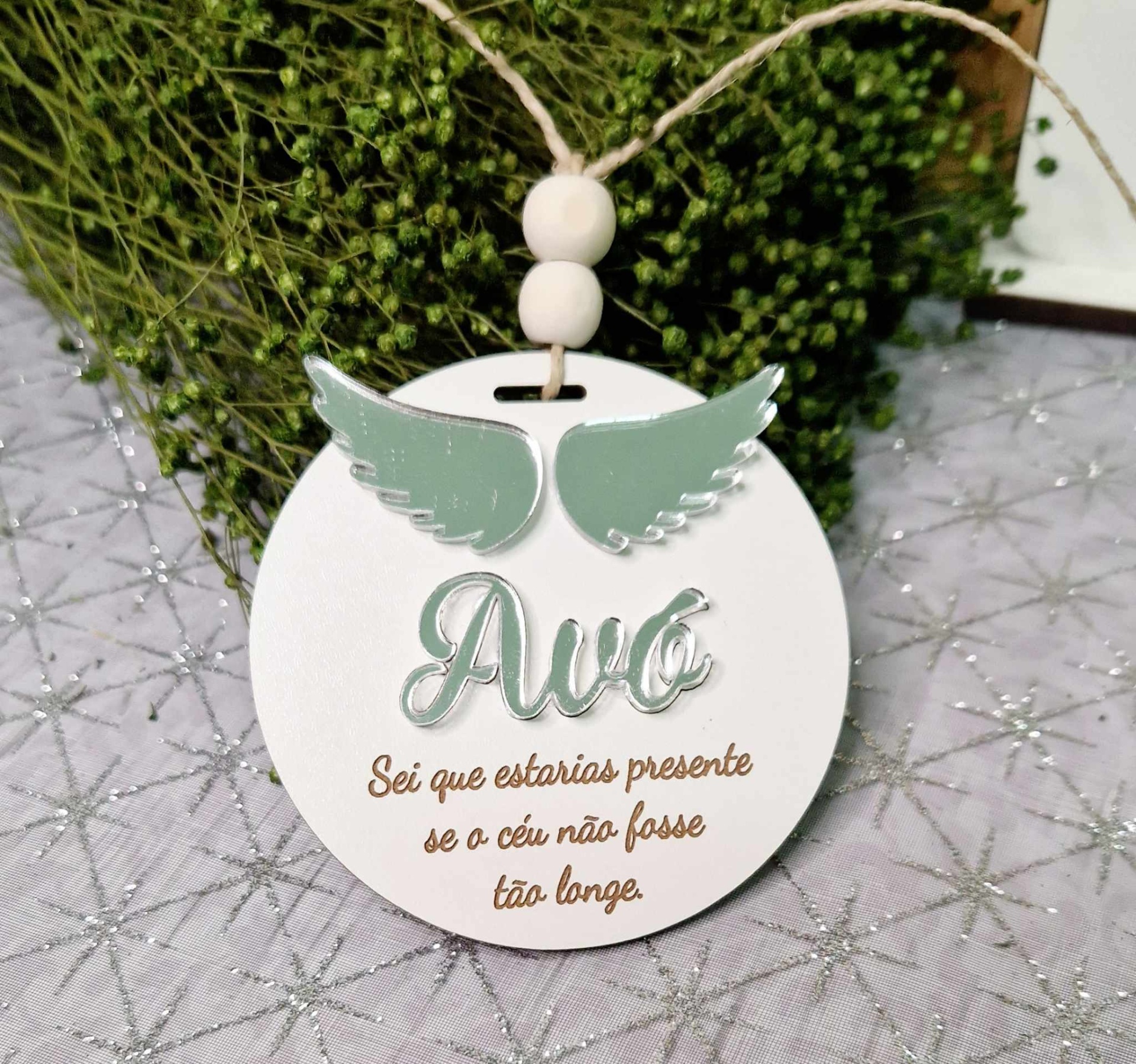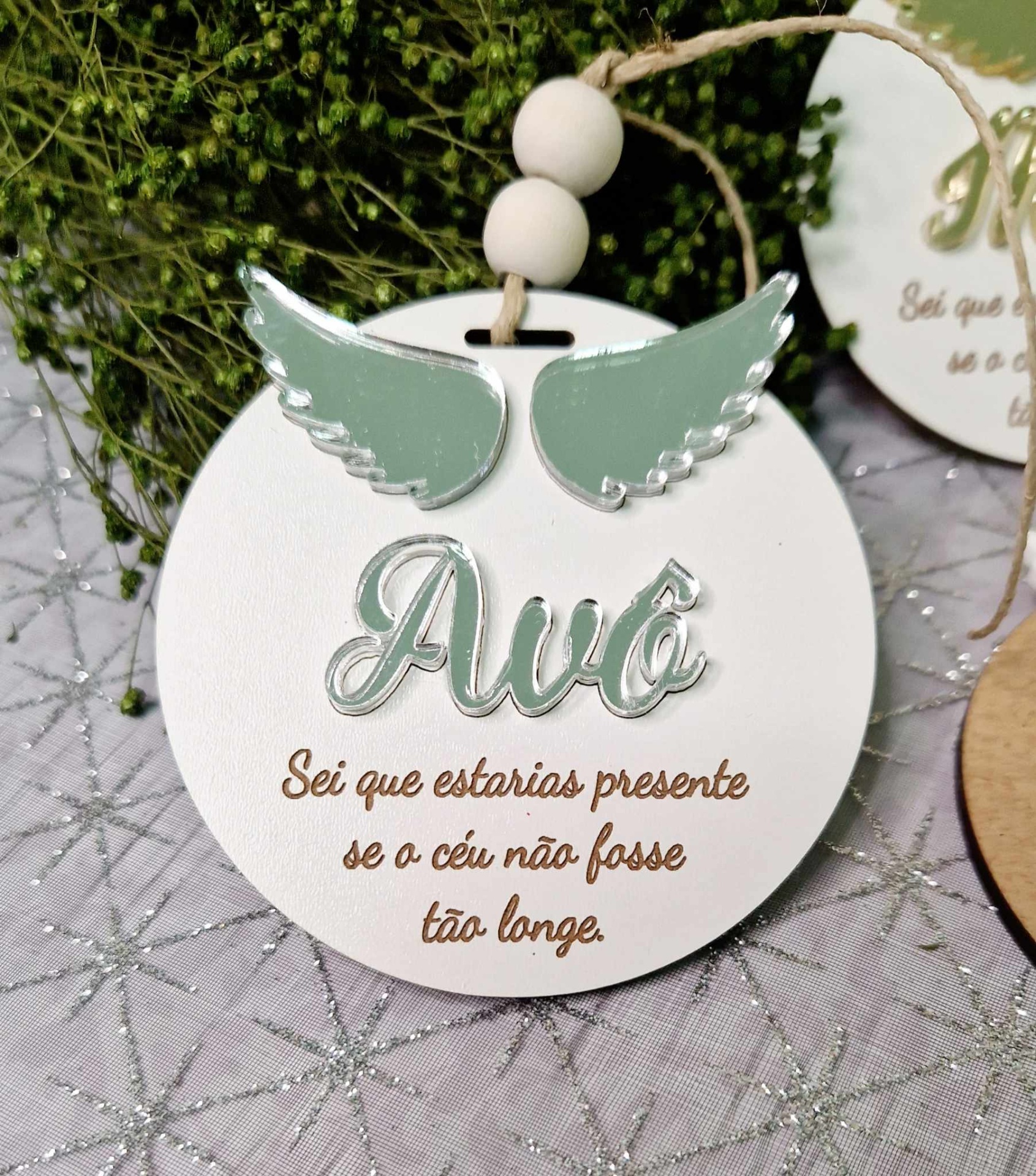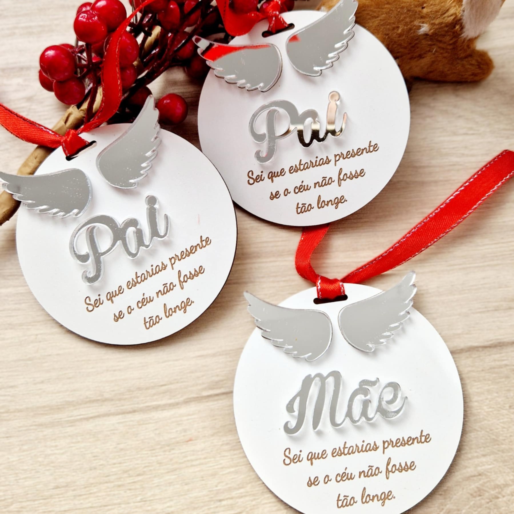 🎄 Cada bola é feita em MDF com asas delicadas e personalizada com o nome que escolheres em acrílico dourado ou prateado.