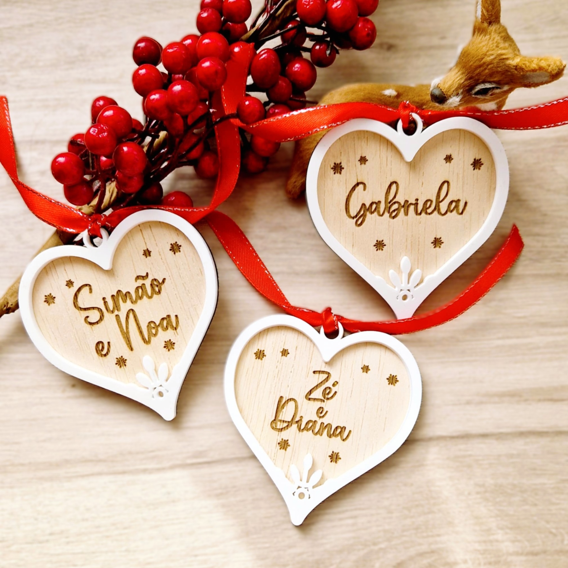 🎄 Ideal para homenagear cada membro da família, este coração é gravado com o nome que escolheres, basta inserir todos os nomes no campo “Personalização”, conforme o número de unidades encomendadas.