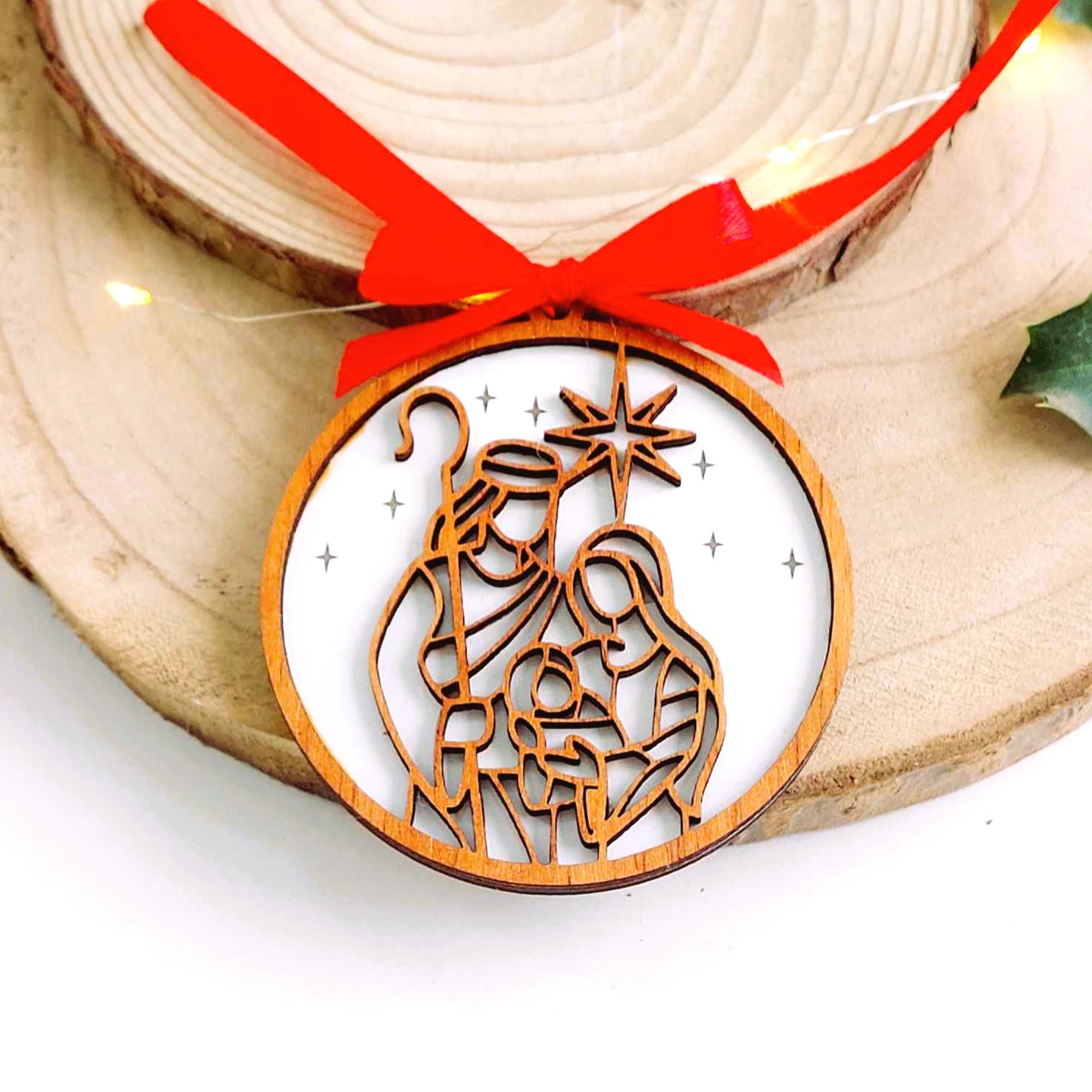 A representação bicolor em MDF da Sagrada Família é um adorno que apresenta José, Maria e o Menino Jesus.