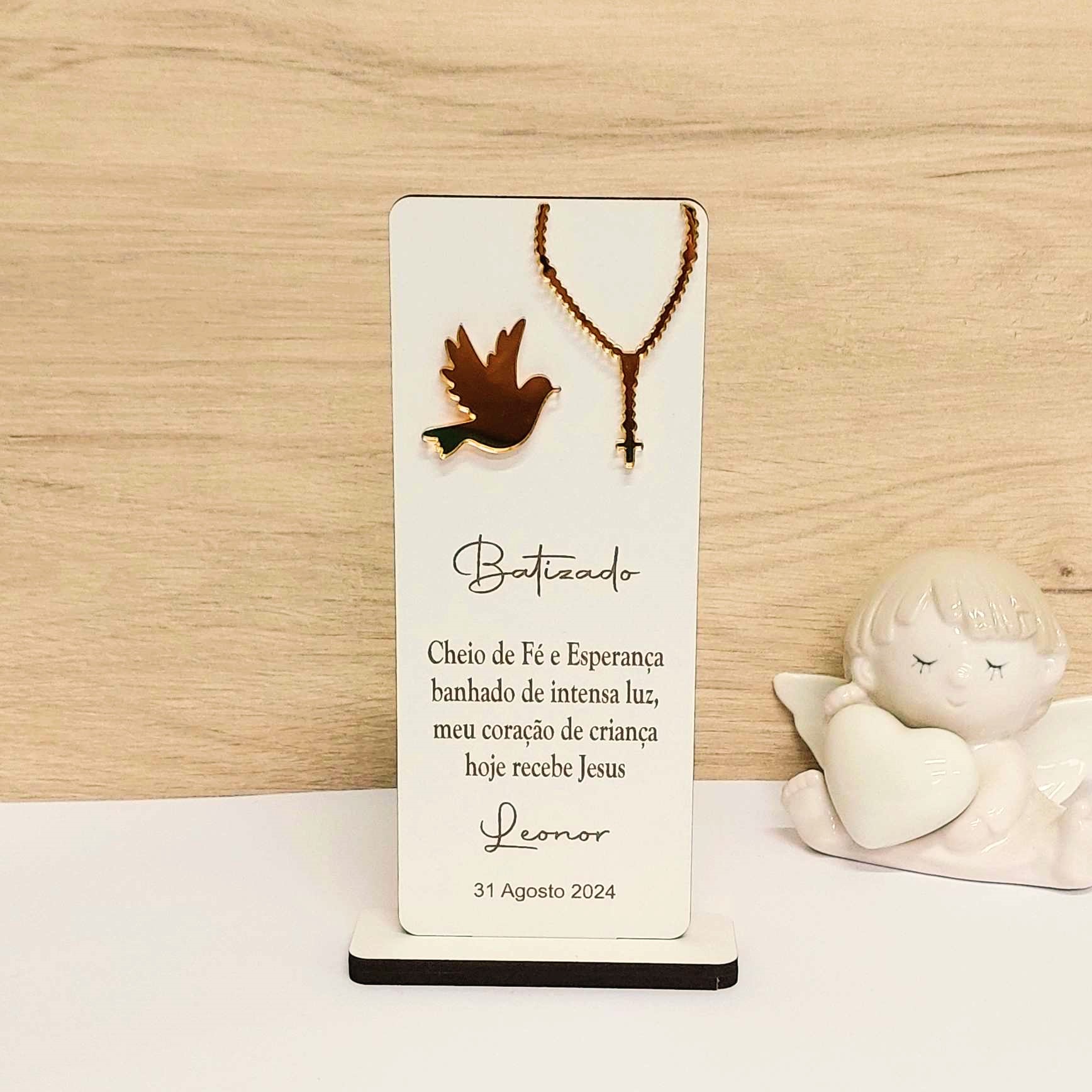 Pode personalizar a lembrança com o nome e a data do batizado.