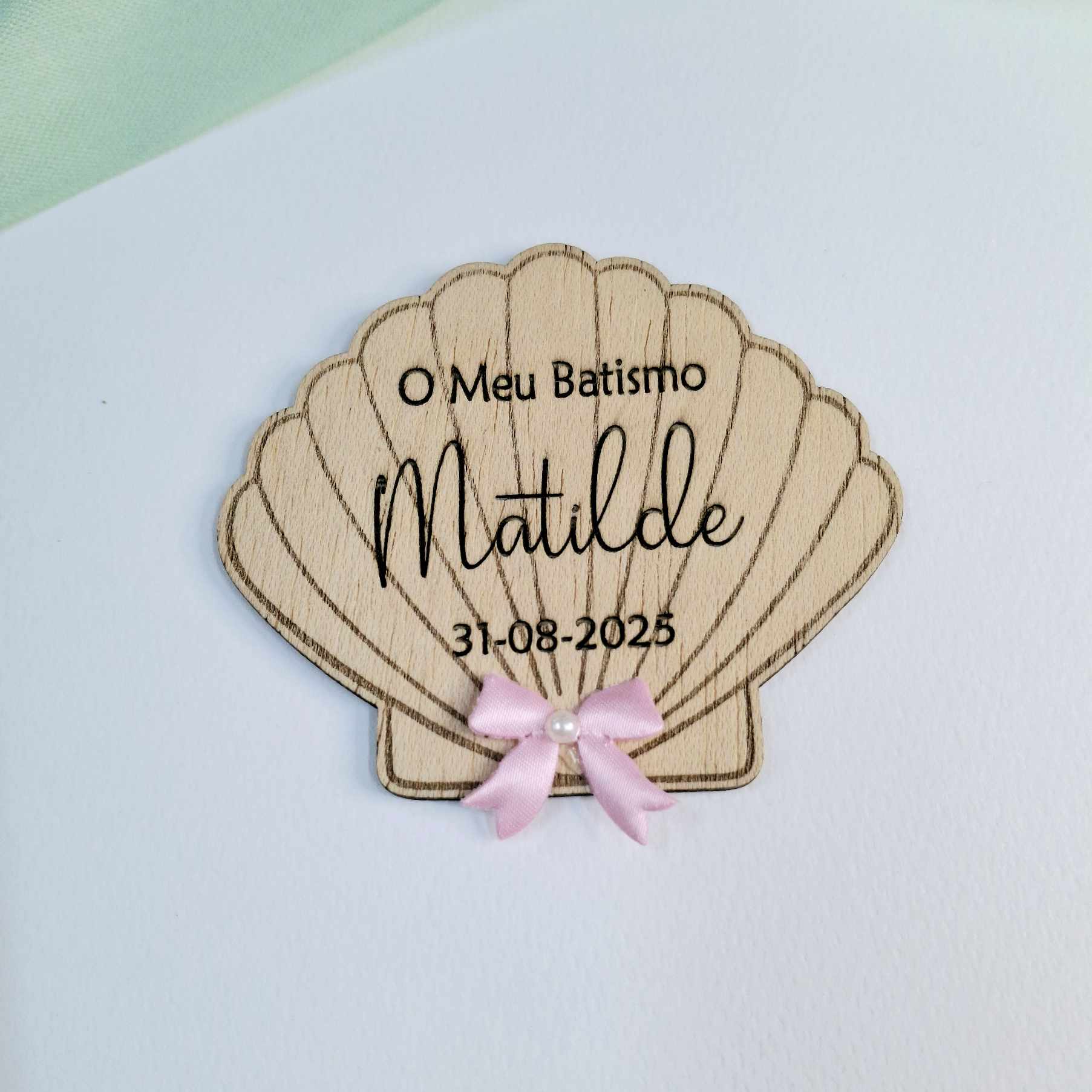 Uma lembrança personalizada em formato de concha feita em madeira é uma peça elegante e significativa, perfeita para eventos como batismo, comunhão, profissão de fé e aniversarios.