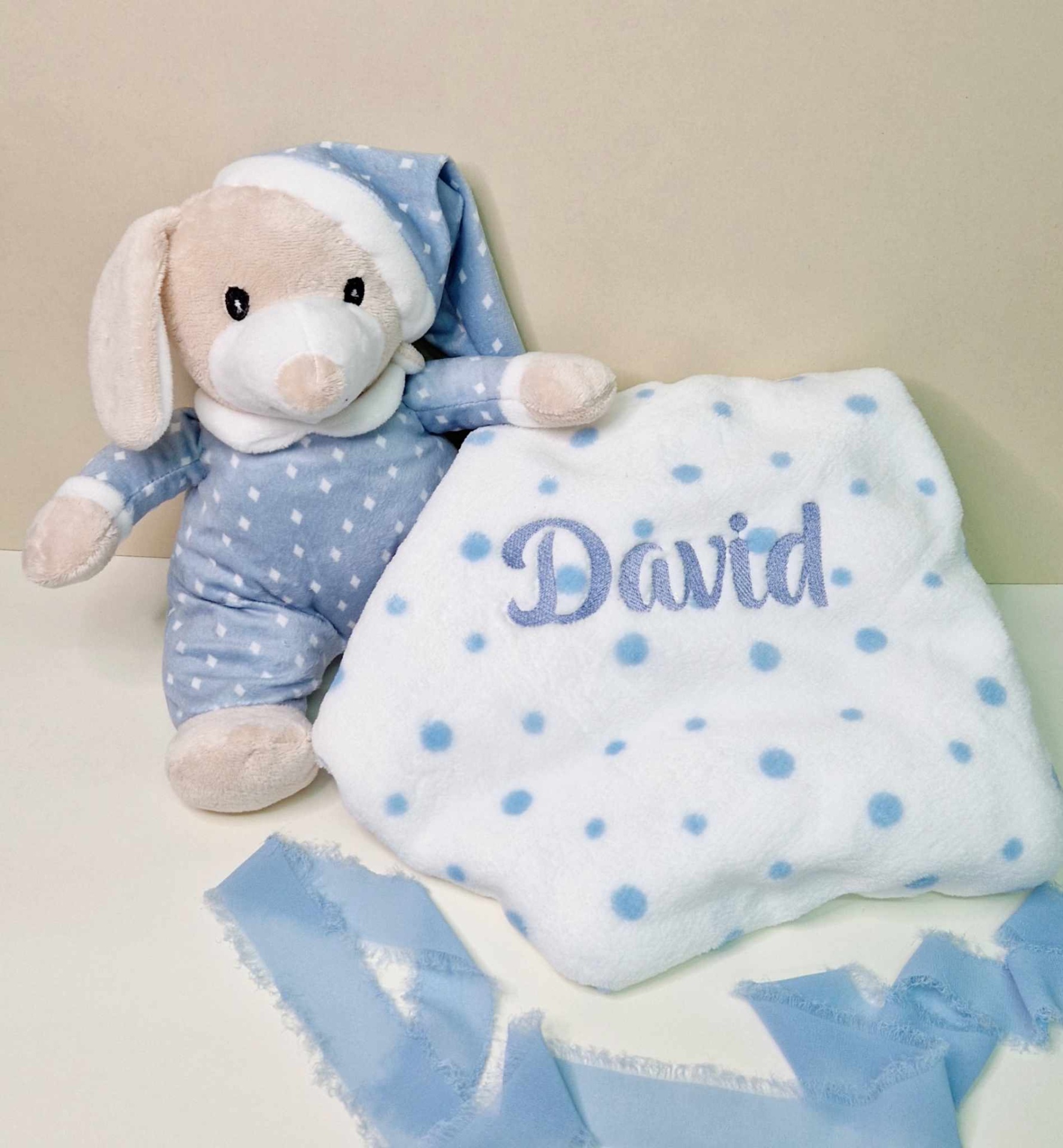 Este conjunto combina o melhor de ambos os mundos: um companheiro de peluche adorável e uma manta macia e personalizada, criando o abraço perfeito para o seu pequeno tesouro.